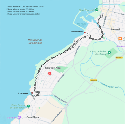 Este agradable trayecto de unos tres kilómetros (solo ida) permite explorar la costa y acceder a varias zonas de baño, incluyendo playas como el Caló de Sant Antoni o Cala Mosques (esta última con acceso mediante escaleras).