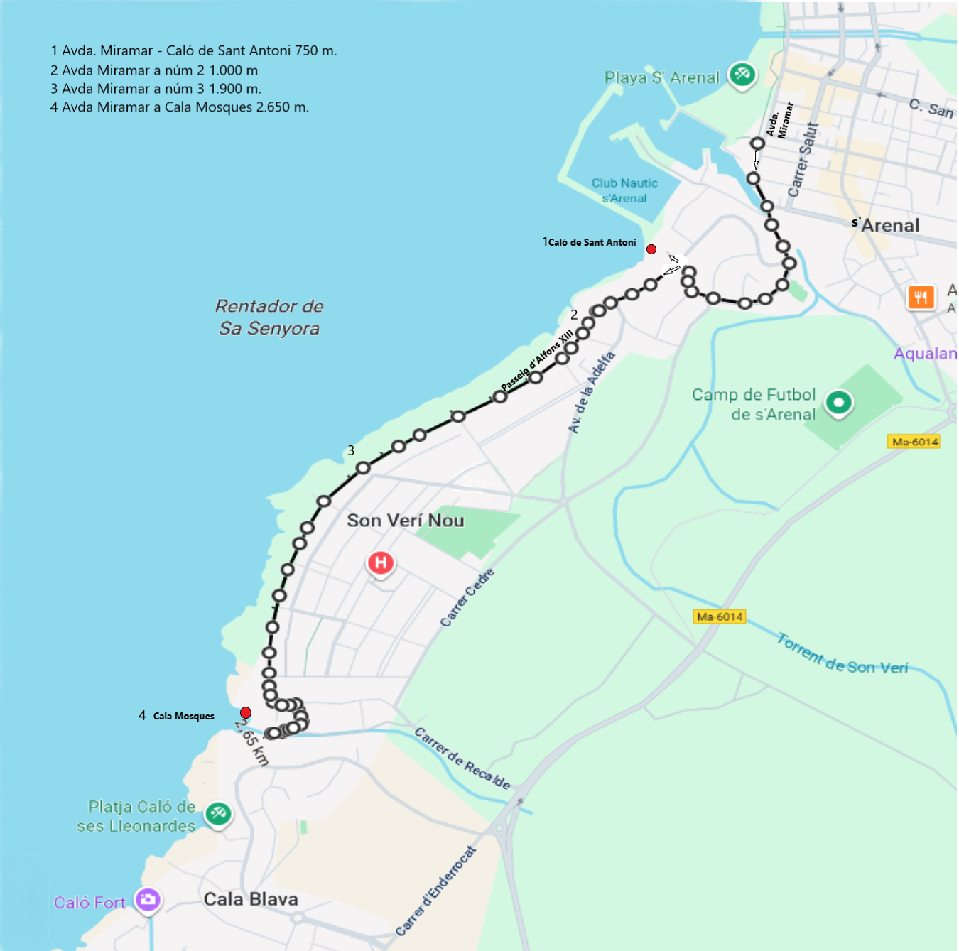 Hacia la derecha, la calle finaliza en el paseo de Alfons XIII, que discurre a lo largo de la costa, frente a la urbanización de Son Verí Nou, hasta llegar a la urbanización de Cala Blava (entrando por la calle Recalde).